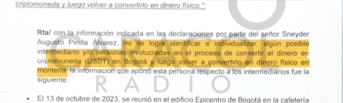 "No se logra identificar e individualizar, algún posible intermediario y/o personas involucradas en el proceso de convertir el dinero en criptomoneda (USDT) en Bogotá y luego volver a convertirlo en dinero físico en montería", explicó las autoridades en el documento.
