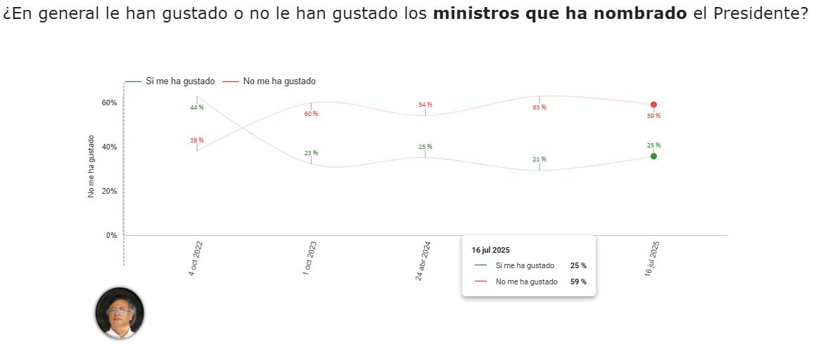 En primer lugar, el estudio preguntó si, en general, han gustado o no los ministros que ha nombrado el presidente: el 59% respondió que no le han gustado, mientras que el 25% aseguró que sí.