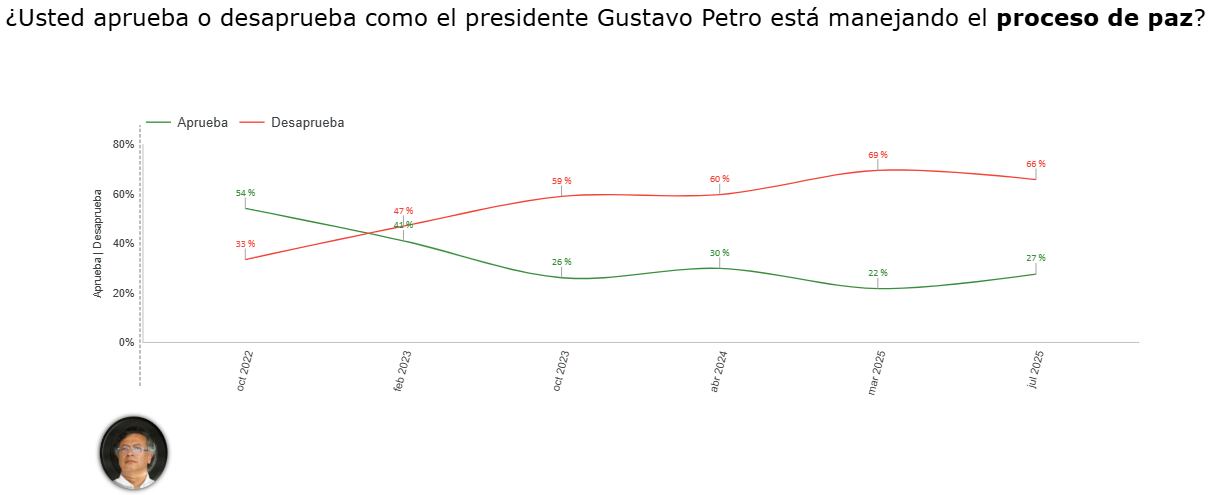 - La manera en que se está manejando el proceso de paz: 27% la aprueba, 66% la desaprueba.