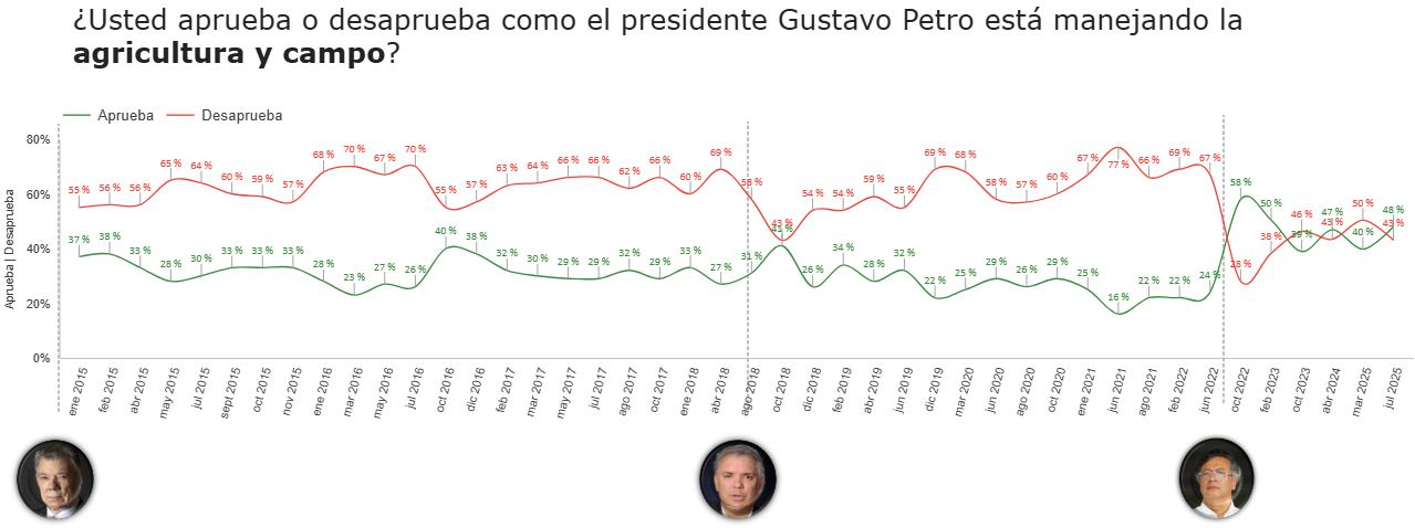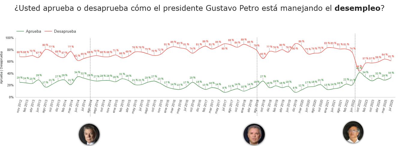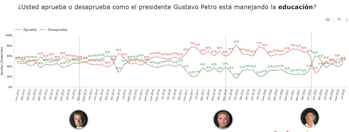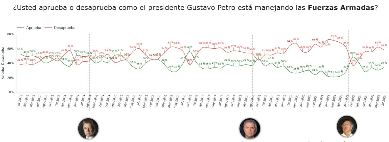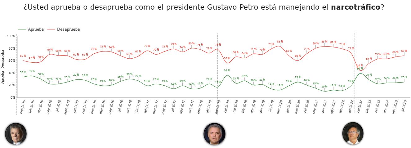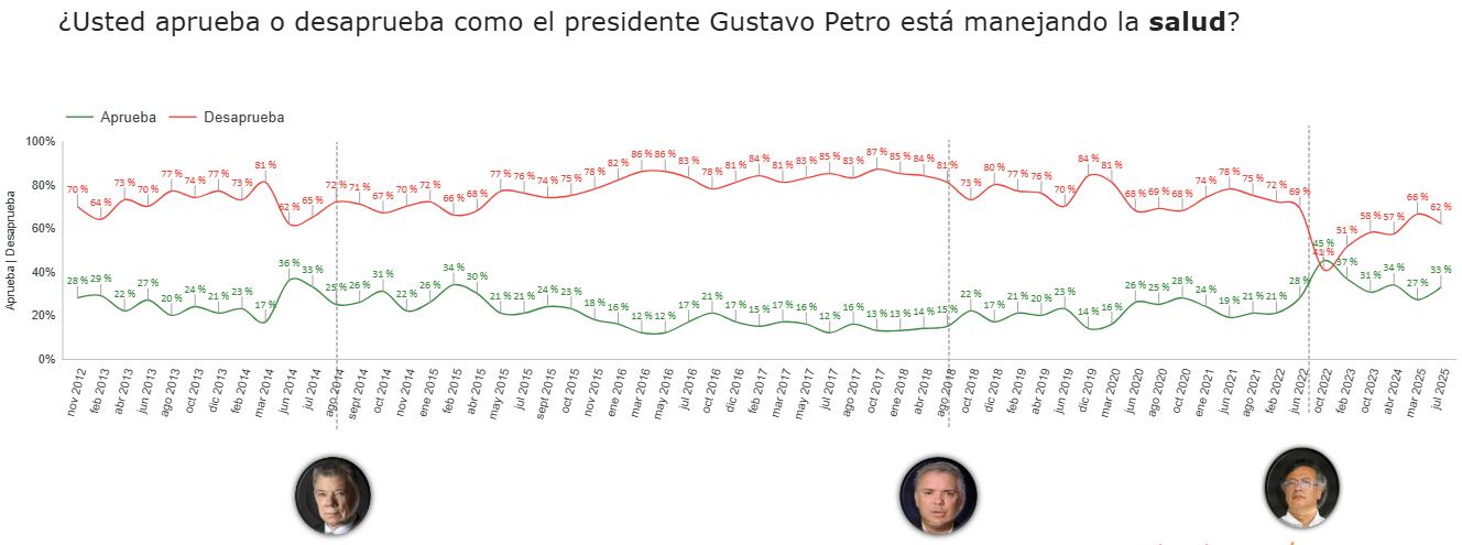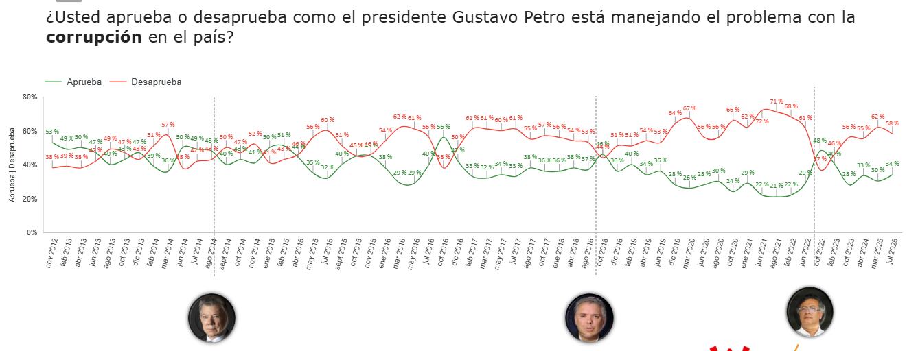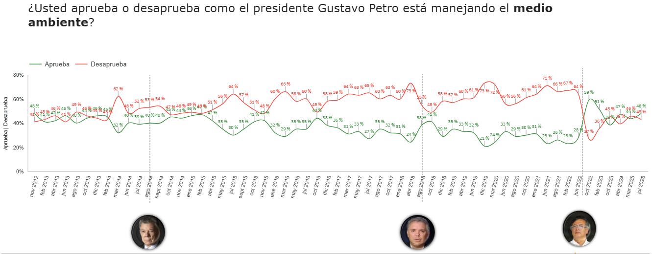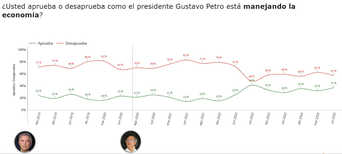 La medición, basada en 900 encuestas aplicadas entre el 2 y el 15 de julio de 2025, evaluó la opinión de los ciudadanos frente a asuntos como la situación política y económica del país, la imagen del Gobierno y su gabinete, así como la confianza en instituciones, personajes públicos, entidades y alcaldías.