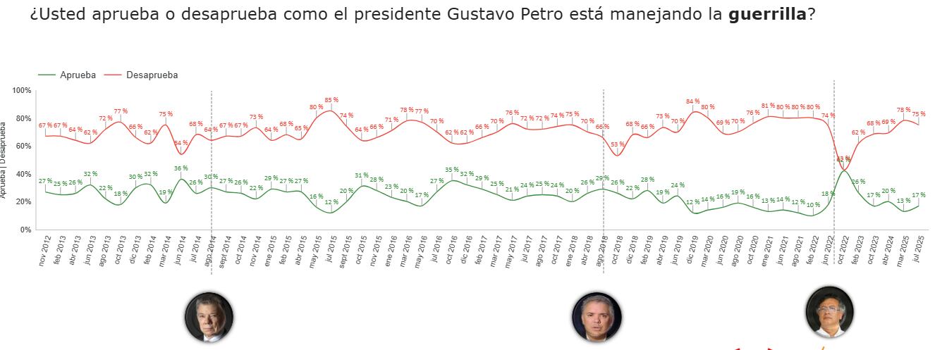 - La manera en que se está manejando la guerrilla: 17% la aprueba, 75% la desaprueba.