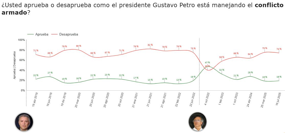- La manera en que se está manejando el conflicto armado: 19% la aprueba, 74% la desaprueba.