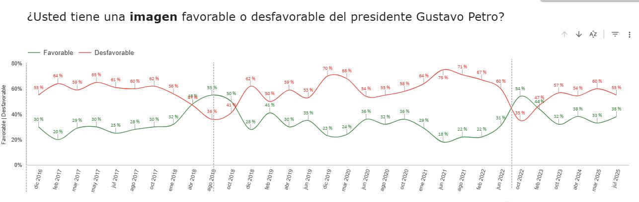 En el segundo capítulo del estudio, enfocado en la imagen y la gestión de la Presidencia de la República en diferentes áreas, se indagó por la imagen del mandatario Gustavo Petro: un 55% respondió que esta es desfavorable, mientras que, para un 38%, esta fue favorable.