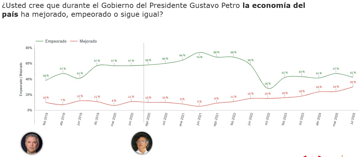 Ante la pregunta ‘¿Usted cree que durante el Gobierno del presidente Gustavo Petro la economía del país ha mejorado, empeorado o sigue igual?’, el 42% consideró que ha empeorado, mientras que para el 30% ha mejorado.