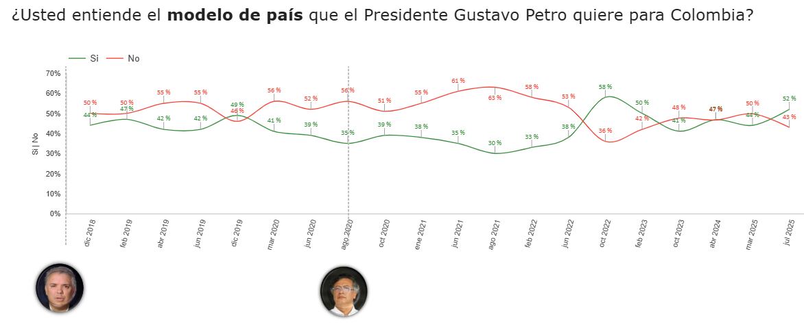 Sobre si se entiende el modelo de país que el presidente Gustavo Petro quiere para Colombia, un 52% respondió que sí y el 43% respondió que no.