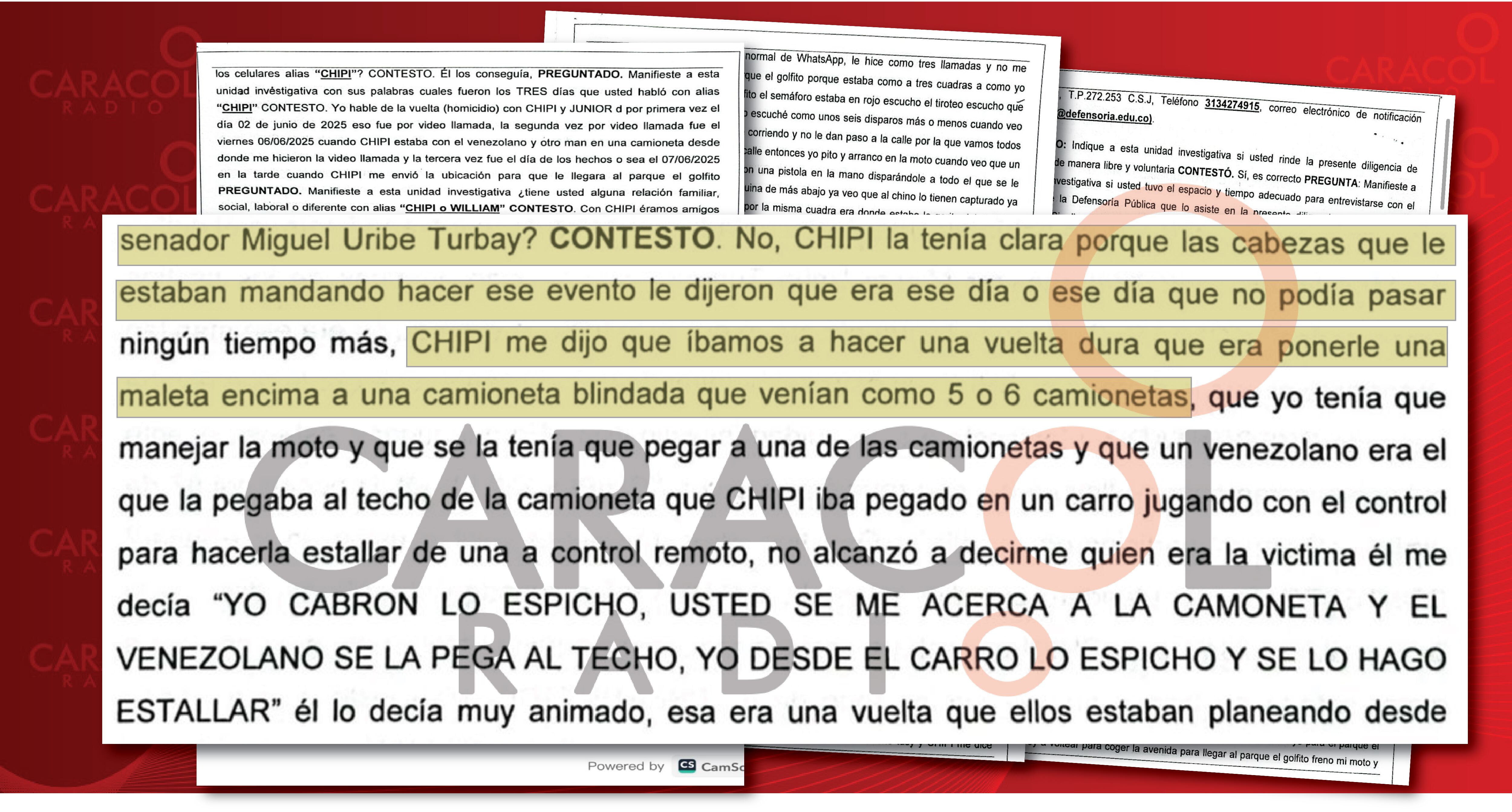 Tenían planeado poner una maleta bomba a la caravana de escoltas de otro protegido. Caracol Radio le cuenta los detalles del interrogatorio y las confesiones que rindió ante la Fiscalía el sexto implicado en el atentado contra el precandidato.