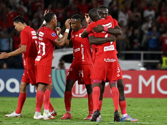 Los jugadores de América de Cali celebran el triunfo ante Bahía. (Photo by JOAQUIN SARMIENTO/AFP via Getty Images) / JOAQUIN SARMIENTO