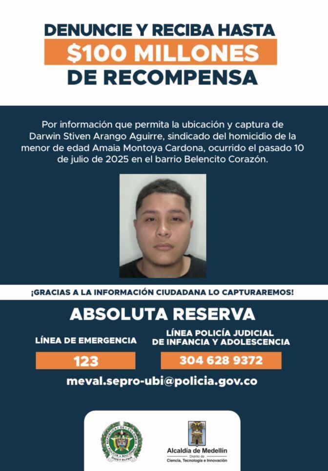 Para incentivar la denuncia de la comunidad, el alcalde de Medellín Federico Gutiérrez mediante su cuenta de X informó que está ofreciendo una recompensa de hasta 100 millones de pesos para lograr la captura de este hombre, quién según las autoridades, es el presunto responsable del asesinato de la menor de dos años Amaia Montoya Cardona. Estos hechos ocurrieron el pasado 10 de julio de 2025 en el barrio Belencito Corazón.
