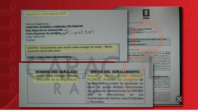 Uno de esos oficios data del 10 de junio con destino a la magistrada Cristina Lombana. La Fiscalía advierte que la exasesora Benavides se compromete a declarar en contra del senador Julio Elías Chagüi Flórez, como el presunto coordinador del redireccionamiento de contratos de la UNGRD que se ejecutarían en los municipios de Lorica, Las Córdobas y Tierralta.