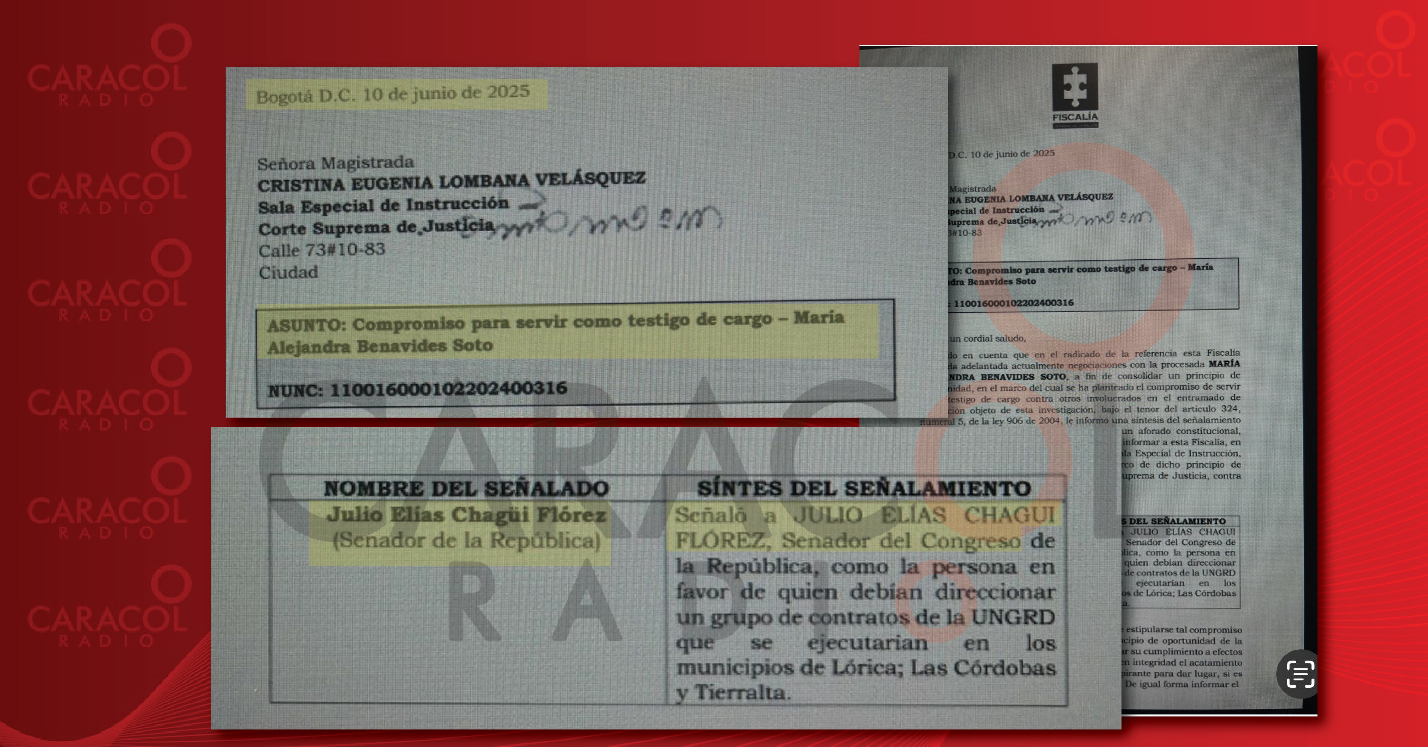 Uno de esos oficios data del 10 de junio con destino a la magistrada Cristina Lombana. La Fiscalía advierte que la exasesora Benavides se compromete a declarar en contra del senador Julio Elías Chagüi Flórez, como el presunto coordinador del redireccionamiento de contratos de la UNGRD que se ejecutarían en los municipios de Lorica, Las Córdobas y Tierralta.
