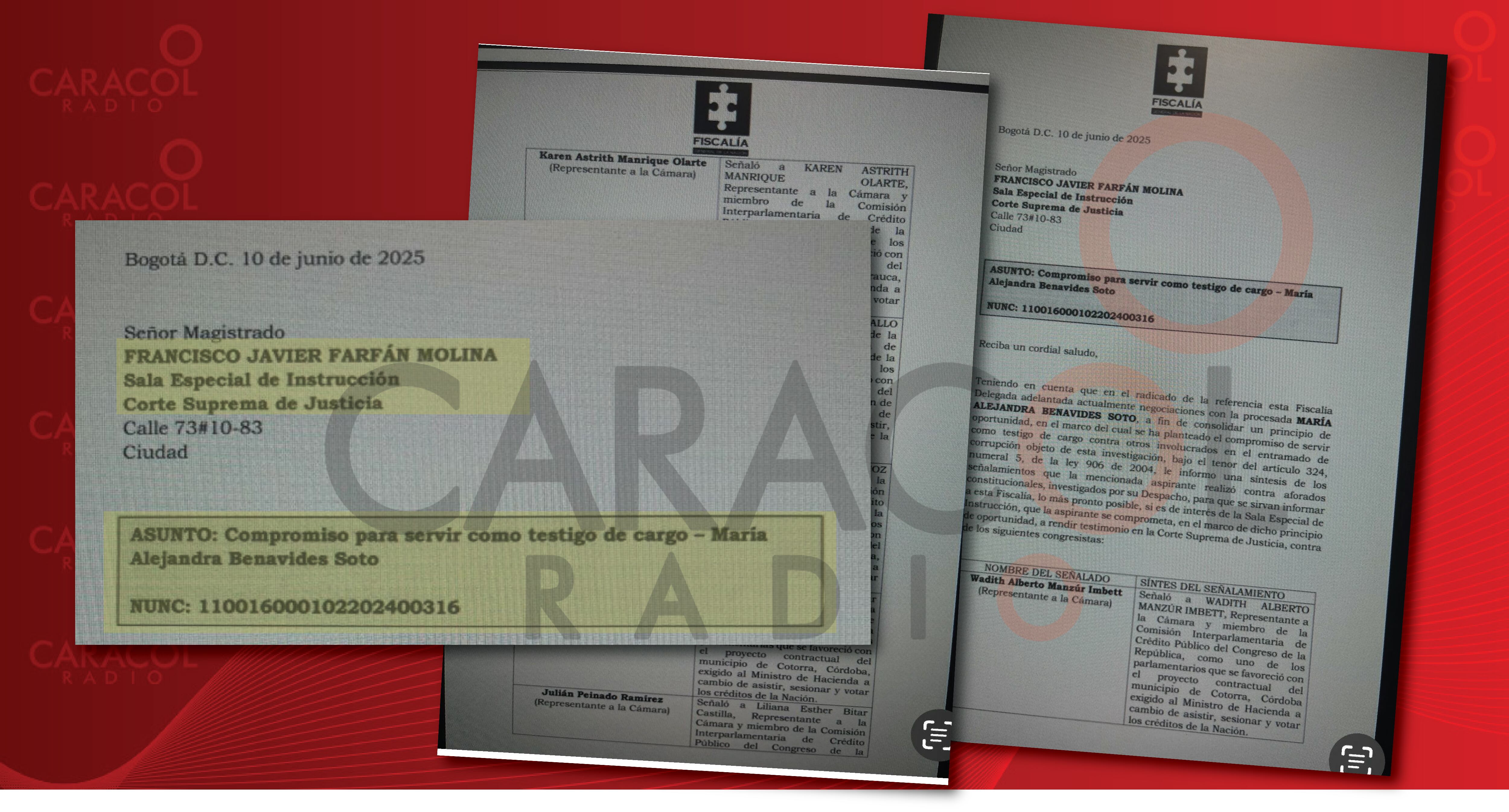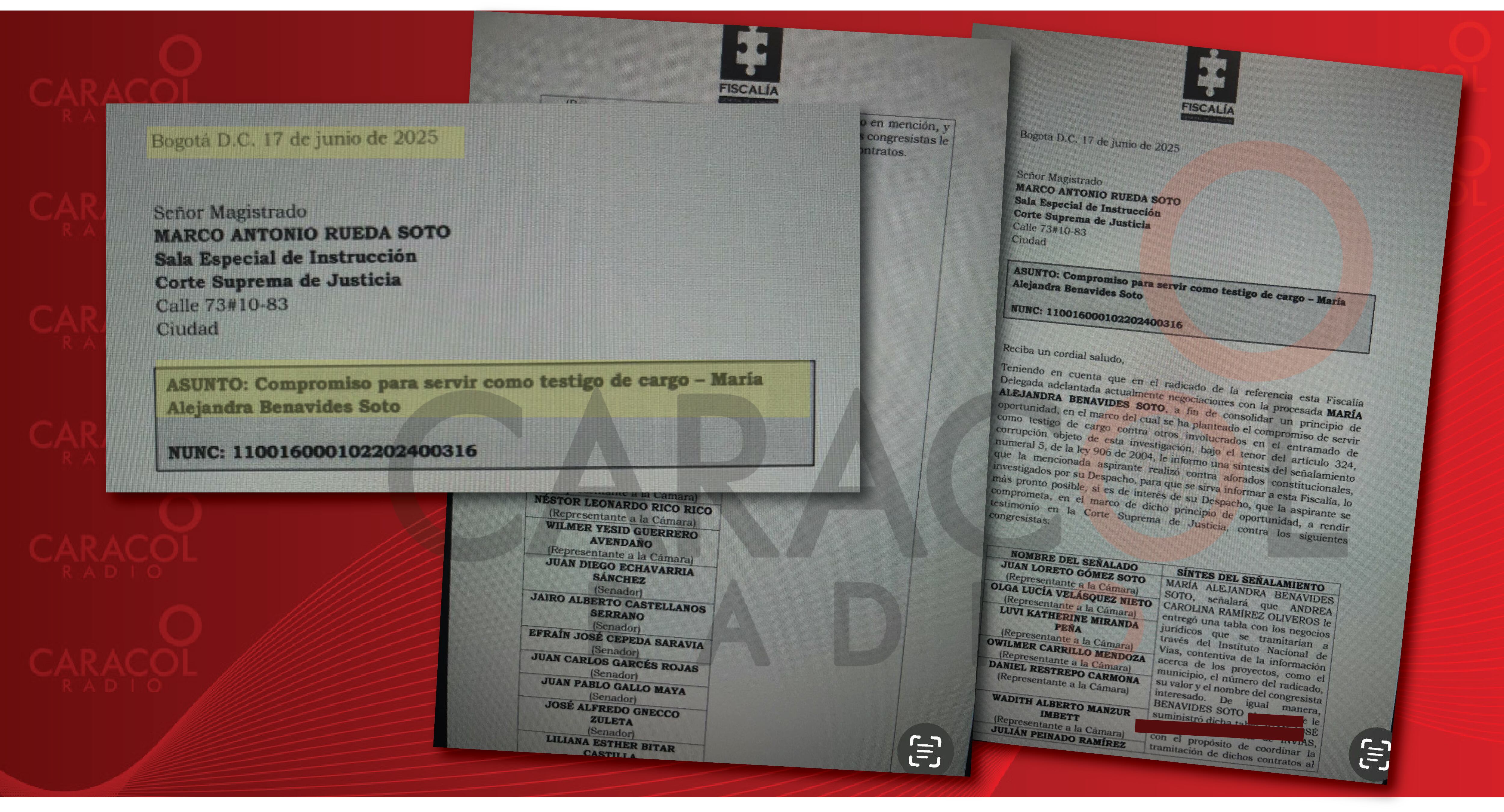 Caracol Radio revela las cartas que la Fiscalía le envió a la Sala de Instrucción de la Corte Suprema de Justicia, donde consta que, María Alejandra Benavides, ahora testigo clave, se compromete a declarar en contra de varios congresistas por los casos de corrupción UNGRD y el INVIAS.