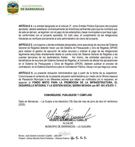 Mediante un decreto, el alcalde de Barrancas designó como ejecutor al Fondo Mixto Sierra Nevada, vinculado con una tradicional casa política.