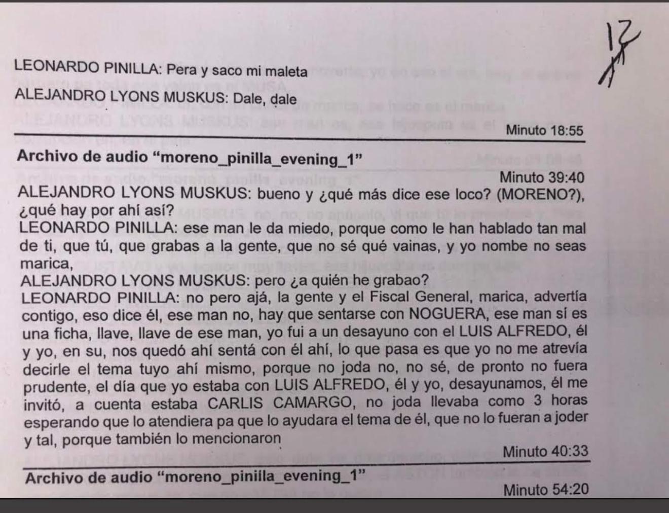 “No, pero ajá, la gente y el fiscal general, marica, advertía eso dice él, ese man no, hay que sentarse con Noguera, man…Ese man si es una ficha clave, llave, clave ese man. Yo fui a un desayuno con él, Luis Alfredo, él y yo. Yo no me atrevía a decirle el tema tuyo en su ahí mismo porque, no joda, no sé, de pronto no fuera prudente. El día que yo estaba con Luis Alfredo, él y yo desayunando, que él me invitó, afuera estaba Carlis Camargo. No joda llevaba como tres horas esperando para que lo ayudara el tema de él, que no lo fueran a jodé y tal, porque también lo mencionaron”.