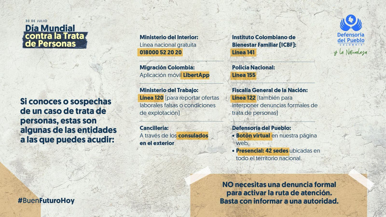 La Defensoría del Pueblo recuerda que no se necesita una denuncia formal para activar la ruta de atención para atender a las víctimas de trata de personas, solo basta con informar a una autoridad.
