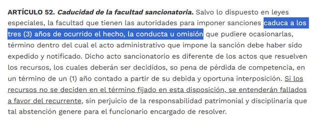 De acuerdo con el artículo 52 de la Ley 1437 de 2011, la facultad sancionatoria de organismos como el CNE “caduca a los tres años de ocurrido el hecho, la conducta u omisión que pudiere ocasionarlas”, que es el plazo “dentro del cual el acto que impune la sanción debe haber sido expedido o notificado”.