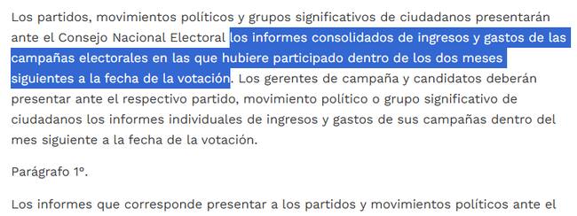 En este caso, la presunta violación de los topes de gastos se entiende ocurrida en los dos meses posteriores a la elección, pues ese es el último plazo que tienen las campañas para entregar sus informes contables al CNE según la ley.