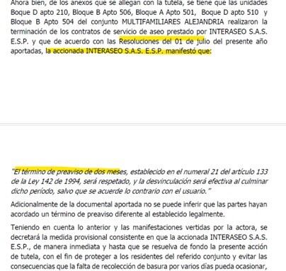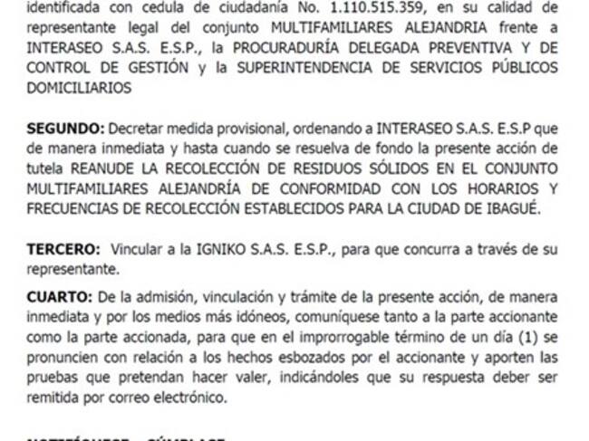 La administración del conjunto afectado presentó acción de tutela por la interrupción injustificada del servicio por Interaseo, a la cual el 29 de julio el juez cuarto laboral del circuito de Ibagué como medida provisional ordenó a Interaseo continuar la prestación del servicio por los 2 meses que manifestó se tomaría para entregar materialmente a los usuarios a IGNIKO S.A.S E.S.P.