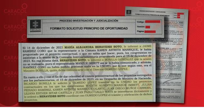 El principio de oportunidad dice que, en medio de las gestiones que realizaron Jaime Ramírez Cobo (entonces enlace de la presidencia con el Congreso de la República) y María Alejandra Benavides para consolidar las solicitudes ilícitas de seis congresistas con contratos por más de $90 mil millones en Córdoba, Arauca y Bolívar, el 12 de diciembre de 2023, la Comisión Interparlamentaria de Crédito Público aprobó cinco créditos a la Nación quedando solo uno por aprobar.