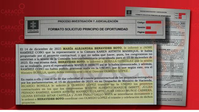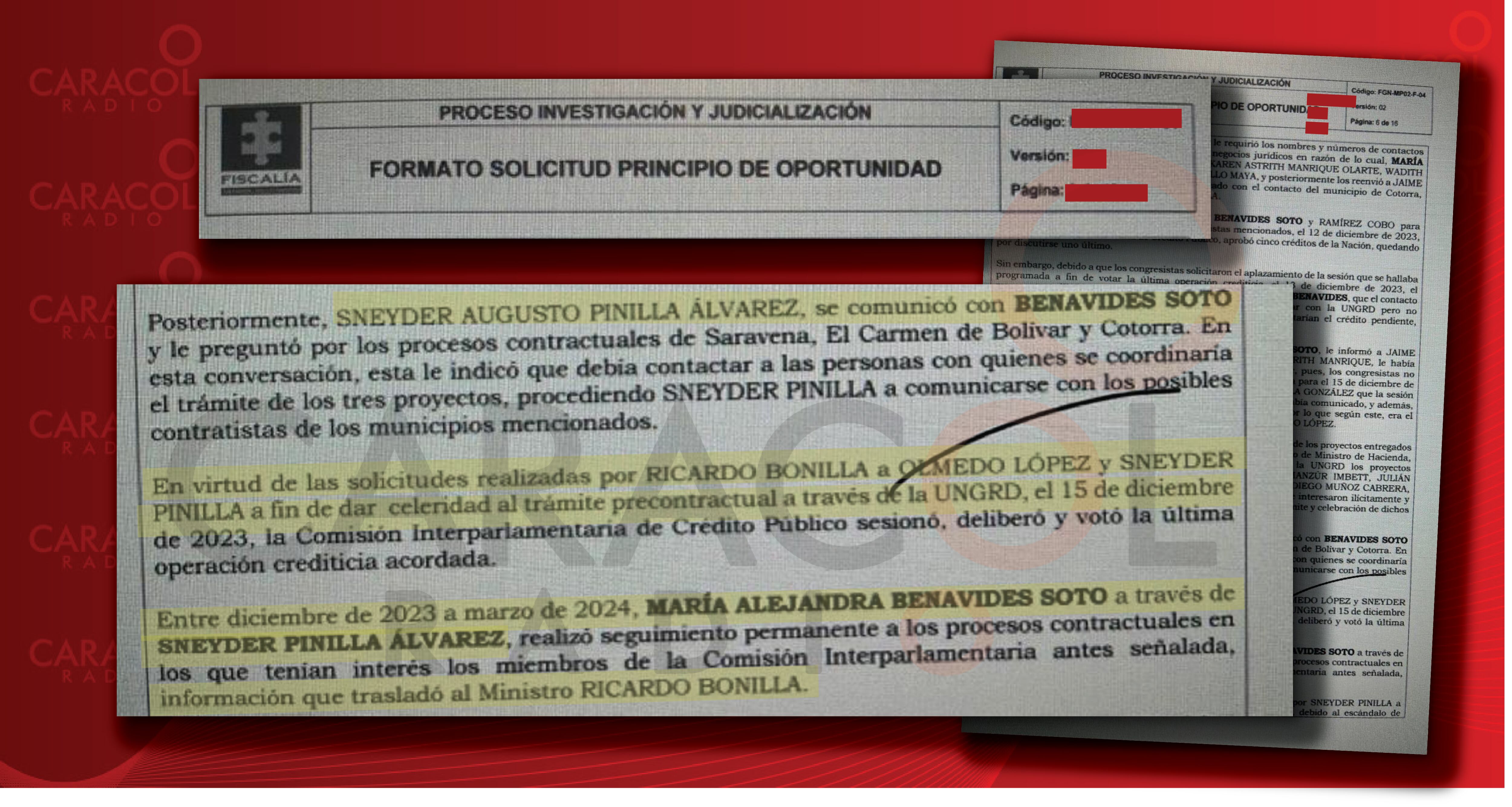 El principio de oportunidad dice que, en medio de las gestiones que realizaron Jaime Ramírez Cobo (entonces enlace de la presidencia con el Congreso de la República) y María Alejandra Benavides para consolidar las solicitudes ilícitas de seis congresistas con contratos por más de $90 mil millones en Córdoba, Arauca y Bolívar, el 12 de diciembre de 2023, la Comisión Interparlamentaria de Crédito Público aprobó cinco créditos a la Nación quedando solo uno por aprobar.