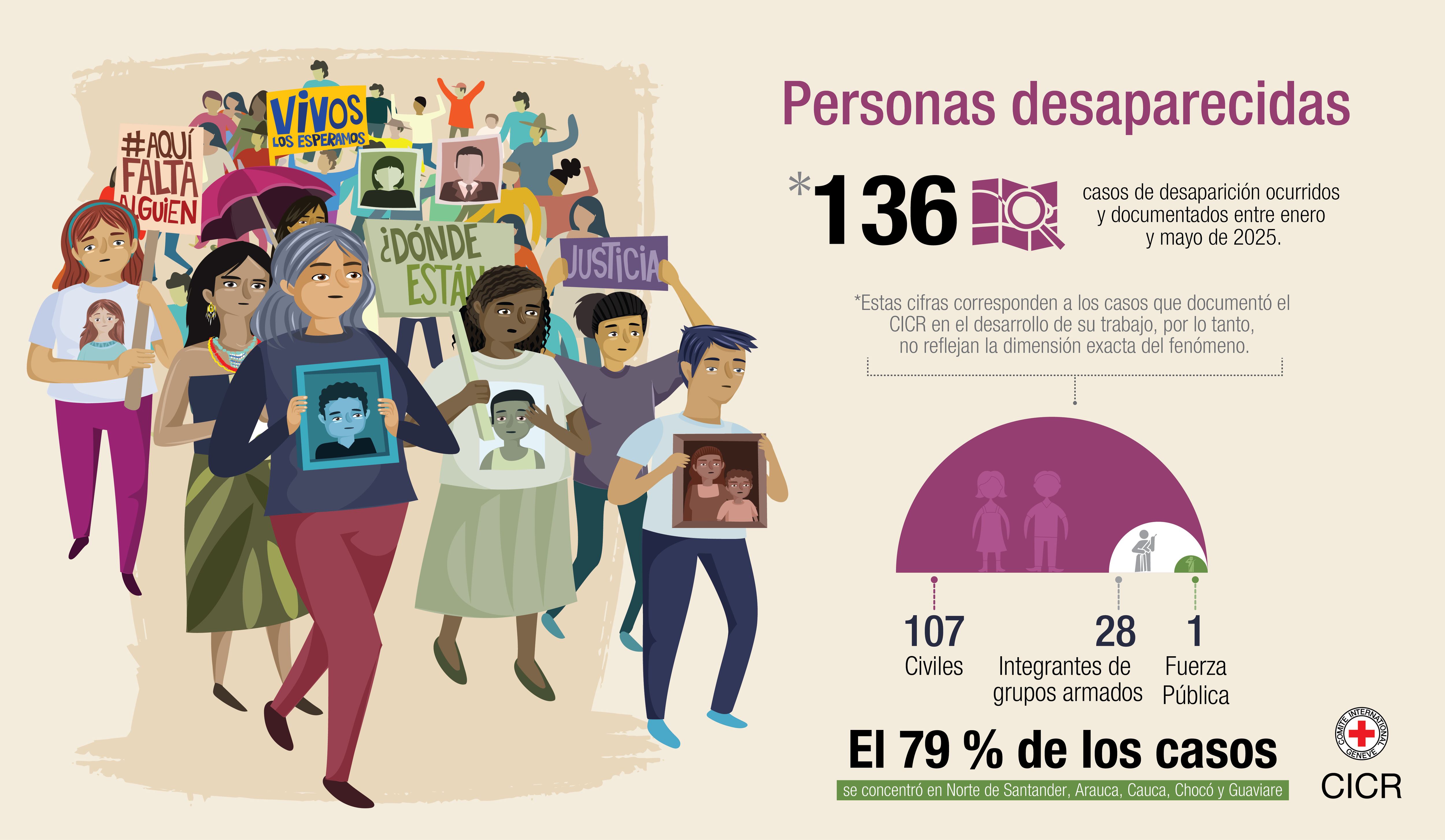 La desaparición de personas continúa siendo una de las consecuencias más dolorosas. Entre enero y mayo, el CICR documentó 136 nuevos casos relacionados con los conflictos armados, el 79 % de ellos correspondientes a civiles. Entre las personas desaparecidas se encuentran 26 menores de edad. Ocho de estos casos estuvieron relacionados con el reclutamiento y la utilización por parte de actores armados.