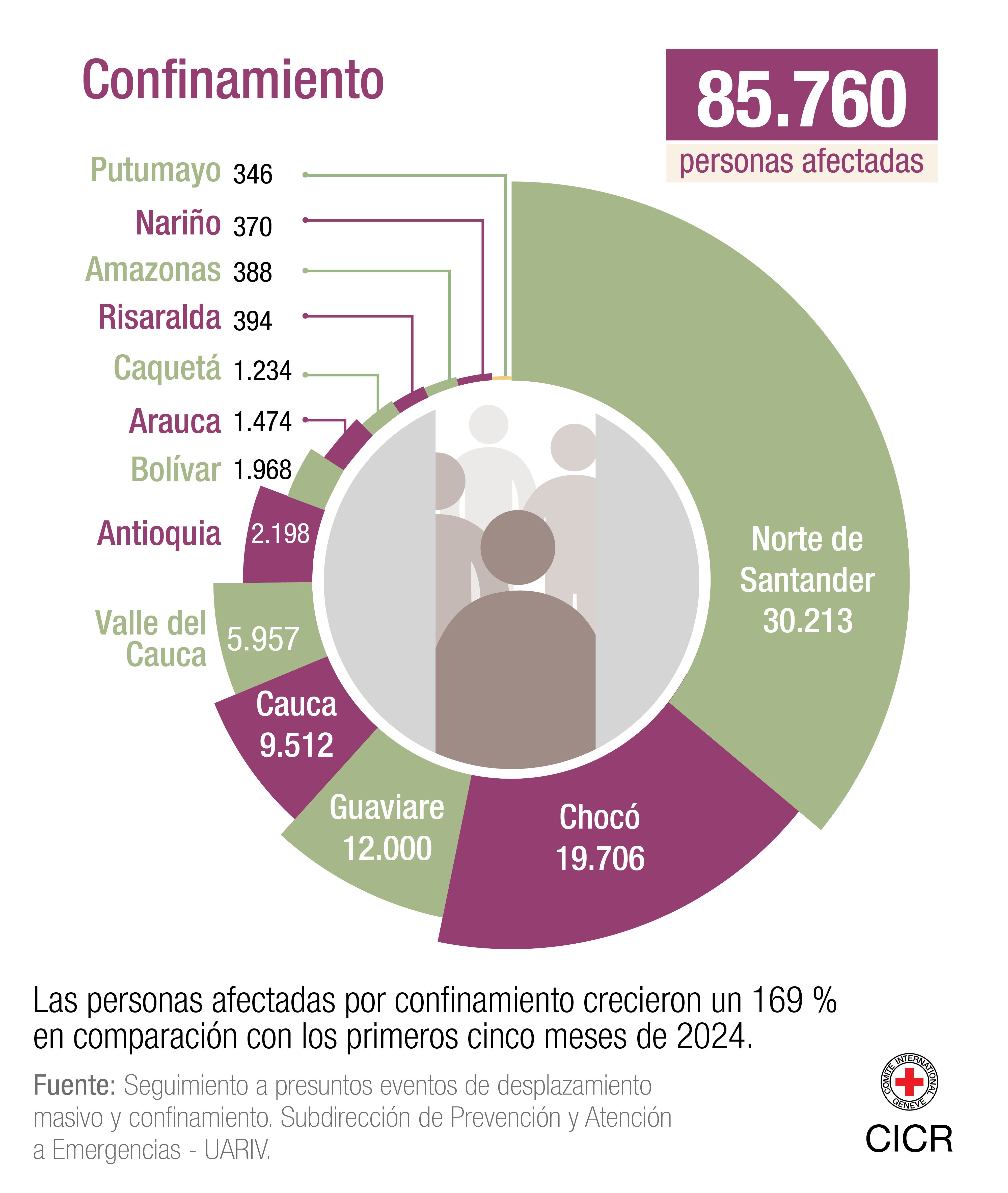 Entre enero y mayo de este año 85.760 personas estuvieron confinadas en 13 departamentos, lo que significa un aumento del 169 % en comparación con los primeros cinco meses del año anterior. Norte de Santander, que no había presentado registros de confinamientos en años recientes, fue la región más afectada en este periodo, con 30.213 personas.