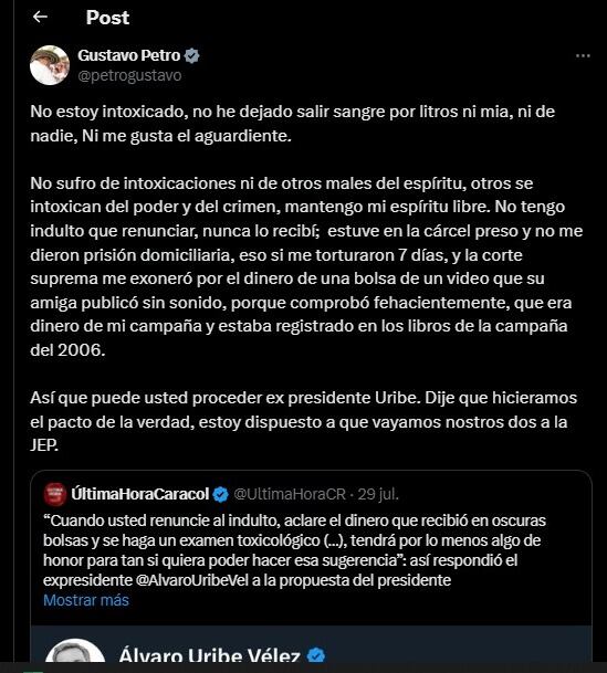 Lea también: Uribe rechaza sugerencia de Petro de acudir a la JEP: dice que al presidente le falta honor