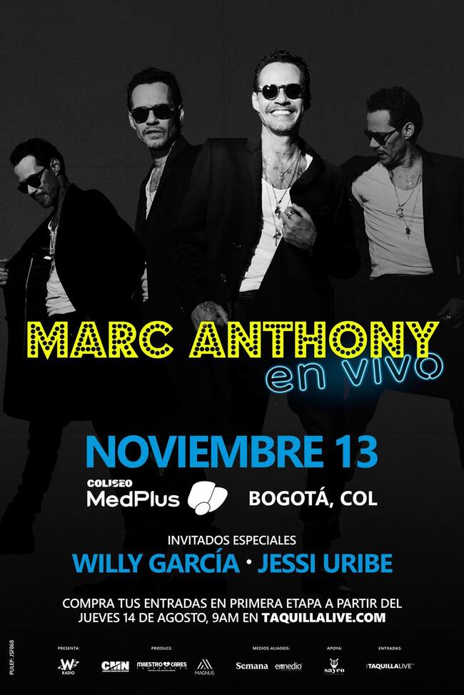 En lo corrido del 2025 Marc Anthony, acaba de pasar por España con fechas agotadas en Bilbao, Madrid, Marbella, Roquetas de Mar, Barcelona, Cádiz, Mallorca y Santa Cruz de La Palma, y continúa confirmando ciudades por todo el mundo. Tuvo una ovacionada presentación el pasado mes de febrero en Viña del Mar y ni hablar de su show en Premios Lo Nuestro interpretando “Volver”, al lado de los colombianos de Piso 21 y Beéle. Las entradas para este show en Bogotá, el próximo jueves 13 de noviembre en el Coliseo MedPlus, Las entradas estarán a la venta el próximo 14 de agosto a las 9 a.m. en Taquillalive.com.