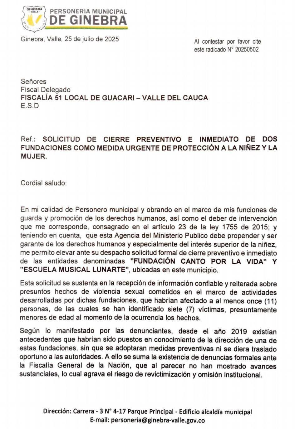 La personería de Ginebra, Valle, pidió que sea suspendida temporalmente la actividad de la escuela de música “Canto por la vida”, mientras las autoridades se pronuncian y para garantizar la seguridad de los estudiantes, sus profesores y directivas.