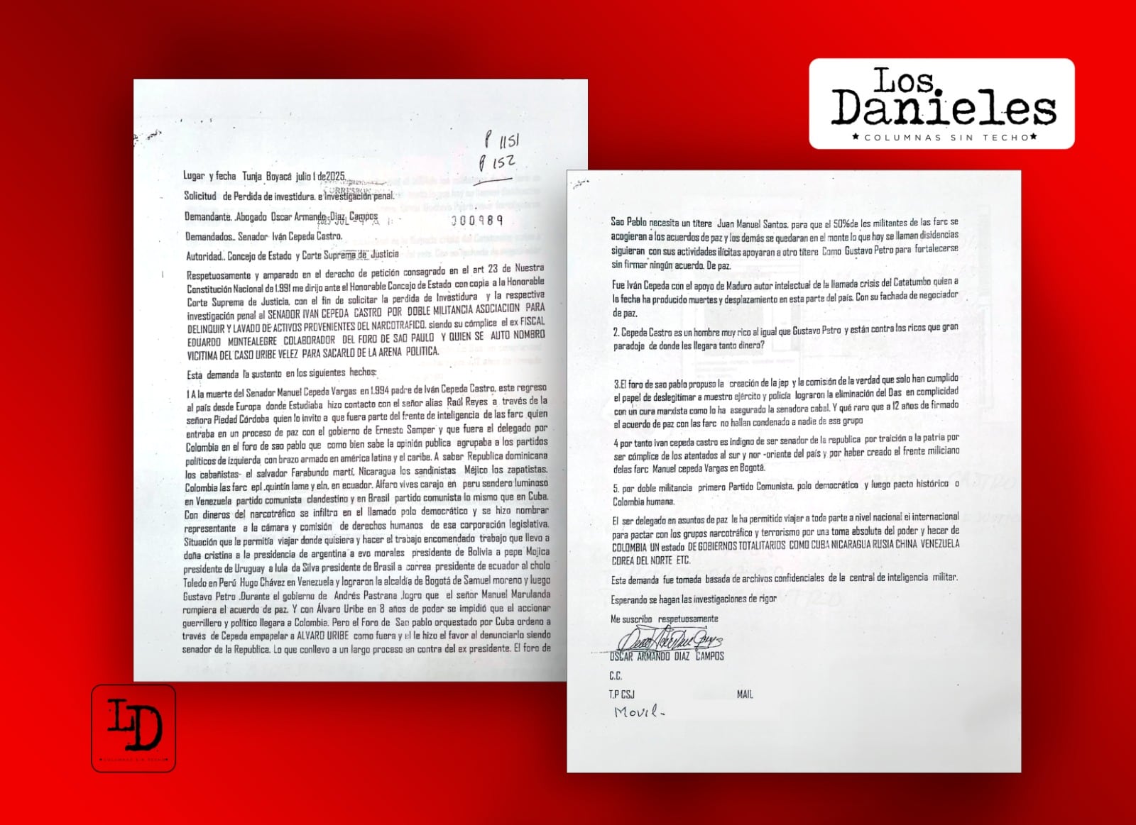 Las acciones judiciales están firmadas por el abogado Óscar Armando Díaz Campos y al pie de su firma aparecen los números de su cédula de ciudadanía y su tarjeta profesional de abogado.