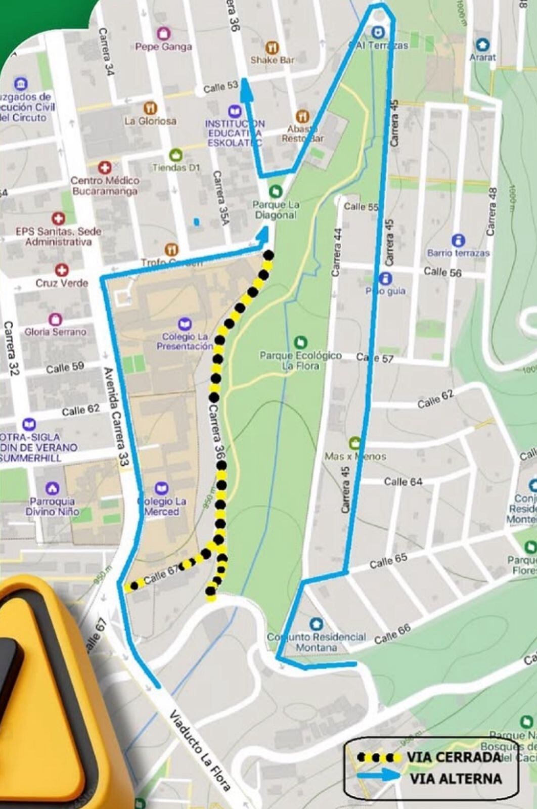 Desde hoy 4 de agosto y por un tiempo de 4 meses se cerrará la carrera 36 entre la vía antigua y la calle 56 de Bucaramanga, frente al Parque La Flora, por actividades de expansión y mejoramiento de las redes de alcantarillado.