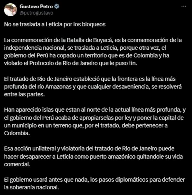 “Creo que son los correctos para tratar este asunto. Y nosotros, los peruanos, siempre vamos a estar abiertos al diálogo con la República de Colombia. Somos países históricos, hemos estado unidos por nuestro pasado y tenemos que seguir unidos en el futuro”, afirmó.