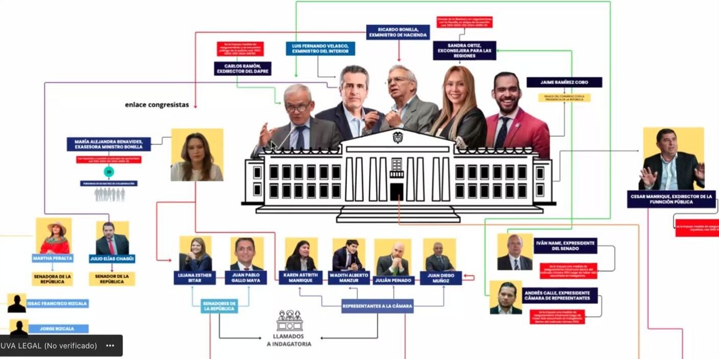 El organigrama lo encabezan exfuncioarios de alto perfil como: Sandra Ortiz (exconsejera señalada mensajera que transportó y entregó sobornos por $3 mil millones) y Carlos Ramon González (exdirector del Dapre que presuntamente dio la orden de pagar las coimas), ambos judicializados.