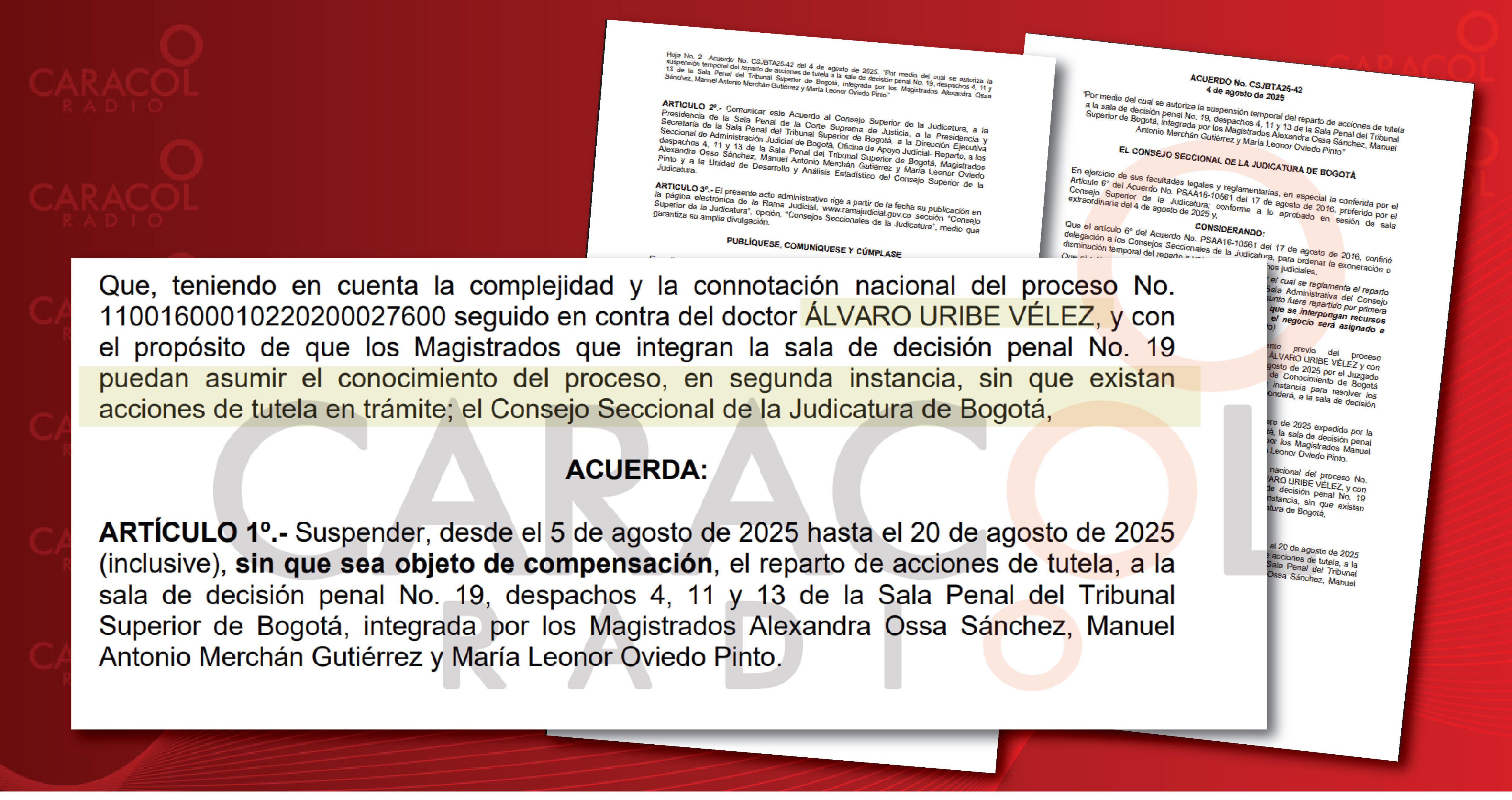 “Teniendo en cuenta la complejidad y la connotación nacional del proceso seguido en contra del doctor ÁLVARO URIBE VÉLEZ, y con el propósito de que los Magistrados que integran la sala de decisión penal No. 19 puedan asumir el conocimiento del proceso, en segunda instancia, sin que existan acciones de tutela en trámite; el Consejo Seccional de la Judicatura de Bogotá… acordó… suspender entre el 5 al 20 de agosto de 2025, sin que sea objeto de compensación, el reparto de acciones de tutela, el reparto de tutelas.