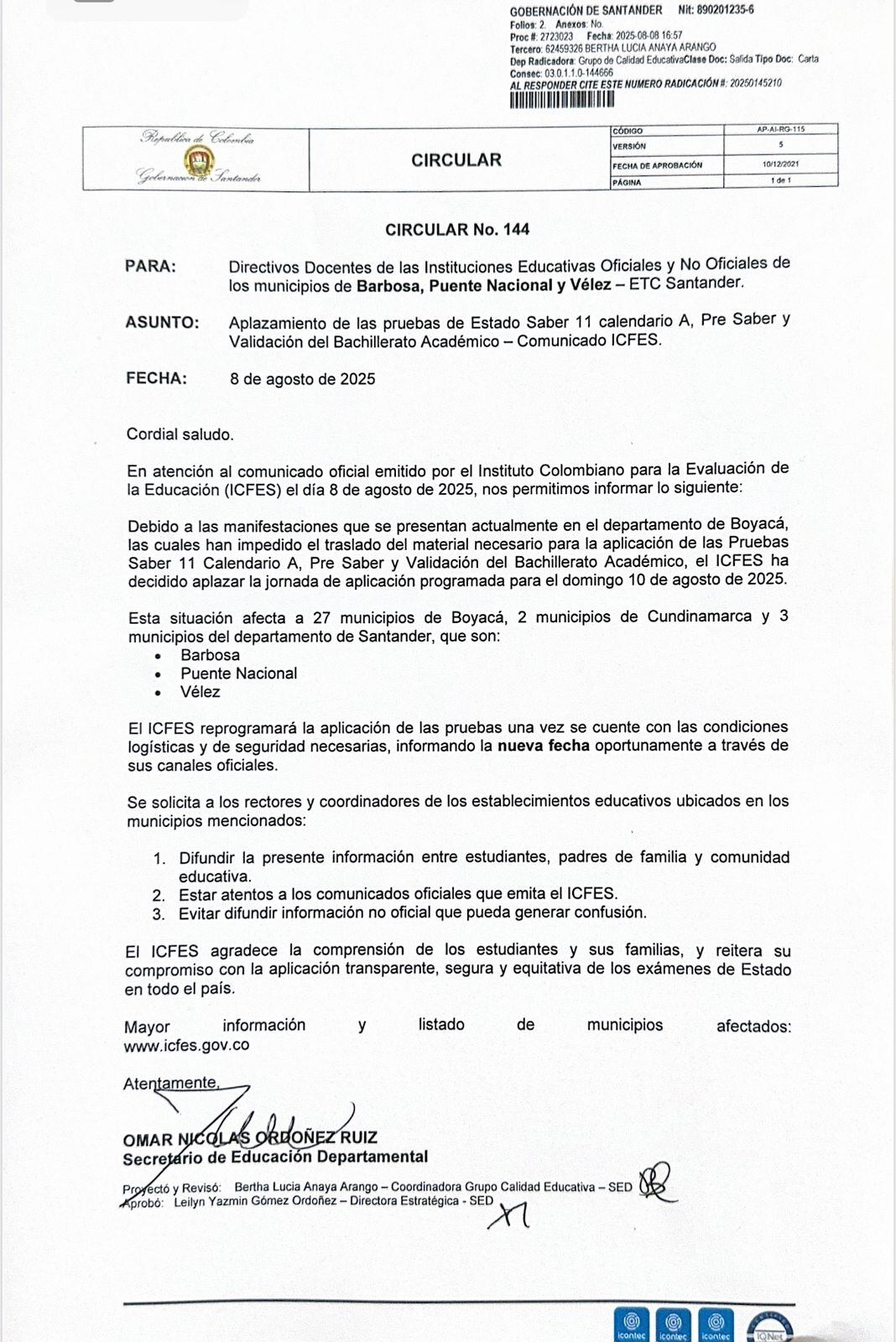 En los municipios de Barbosa, Puente Nacional y Vélez, no se llevarán a cabo las Pruebas Saber 11 calendario A, Pre Saber y Validación del Bachillerato Académico este domingo 10 de agosto, ya que El Instituto Colombiano para la Evaluación de la Educación, ICFES, decidió aplazar las pruebas en estos municipios.