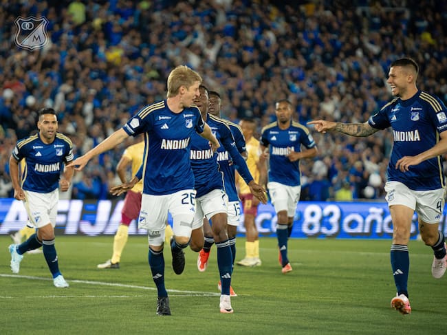 Andrés Llinás junto con Juan Pablo Vargas celebran un gol de Millonarios ante Tolima / Twitter: @MillosFCOficial.