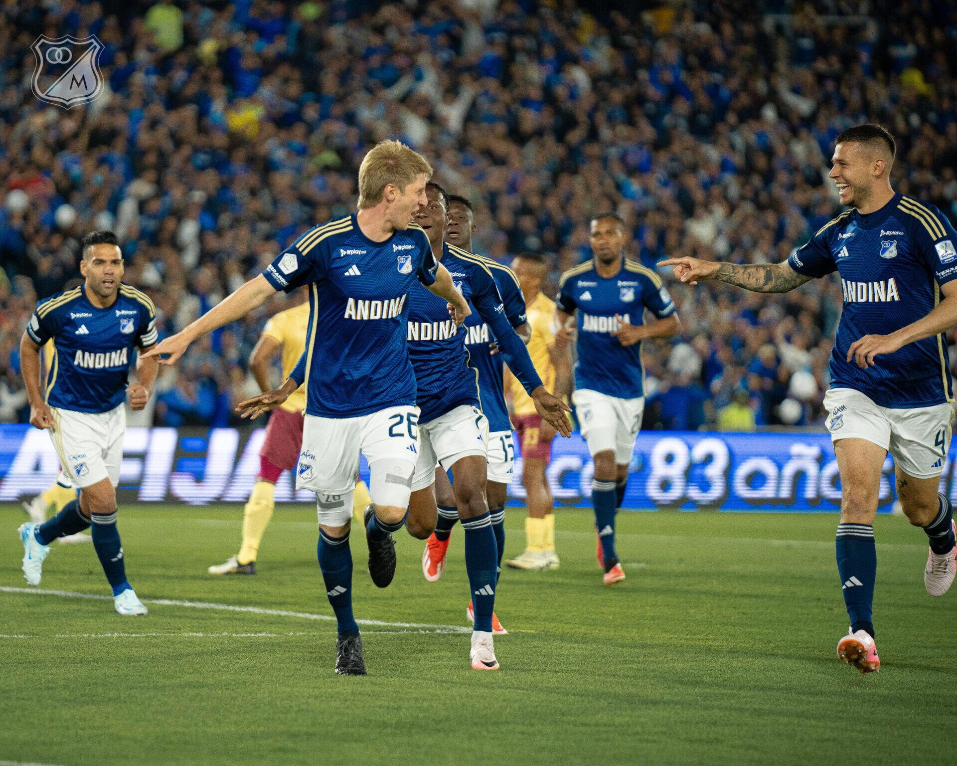 Andrés Llinás junto con Juan Pablo Vargas celebran un gol de Millonarios ante Tolima / Twitter: @MillosFCOficial.