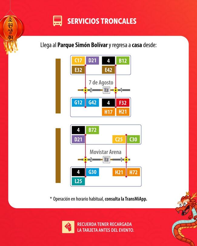 Además, TransMilenio ofrece la opción de regresar a casa en las estaciones 7 de Agosto y Movistar Arena, ubicadas en la troncal NQS Central, a través de las siguientes rutas que operarán en su horario habitual: