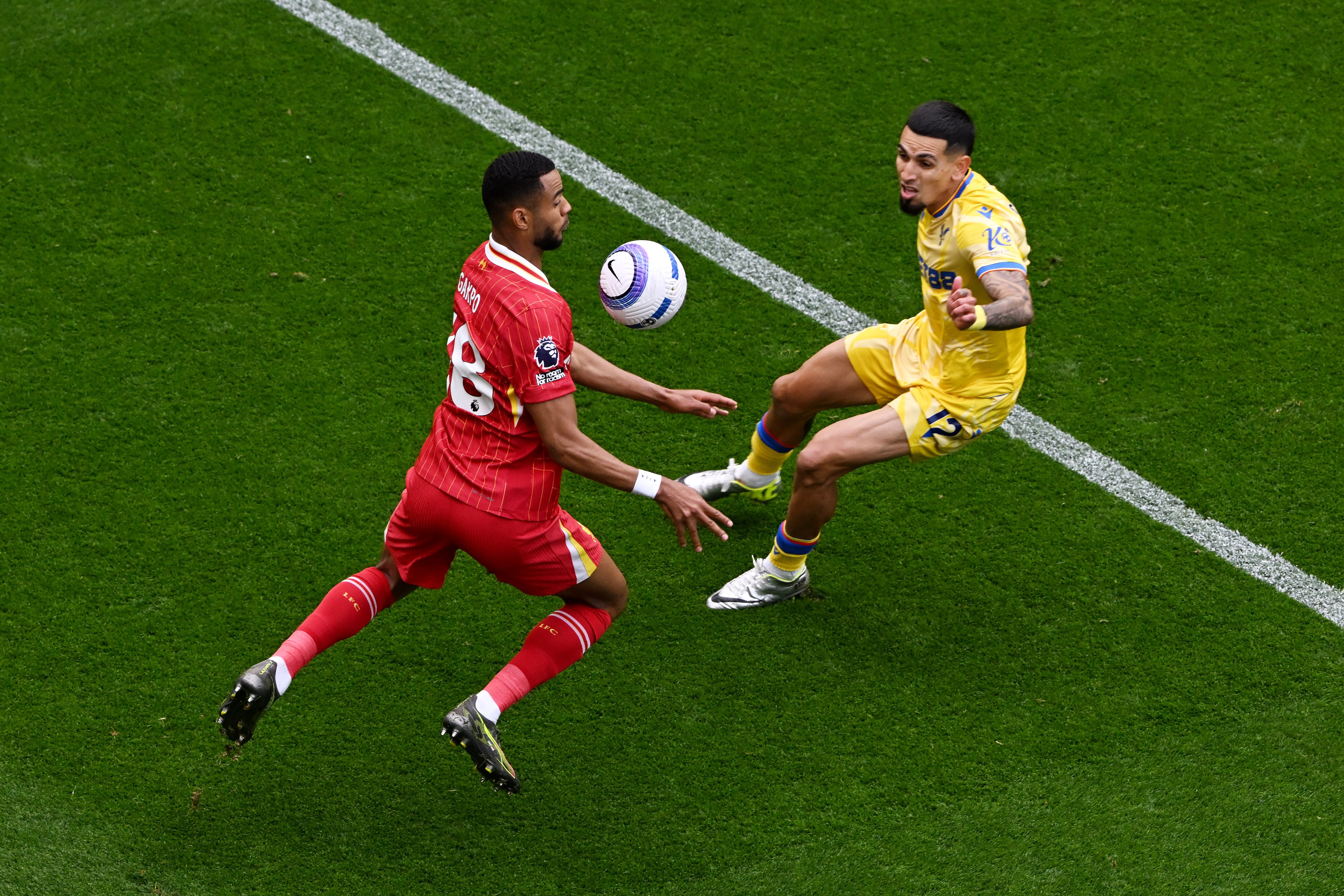 Daniel Muñoz marcando al neerlandés Cody Gakpo en un partido entre Crstal Palace y Liverpool. (Photo by Liverpool FC/Liverpool FC via Getty Images) / Liverpool FC