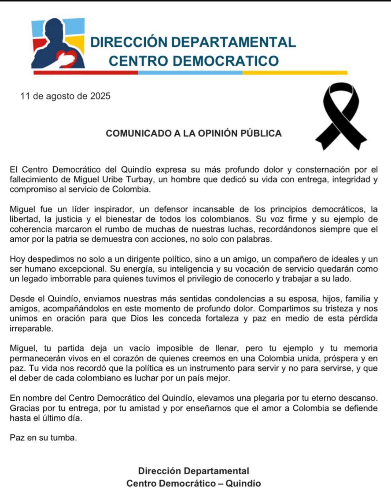 Diversas reacciones se han generado en el Quindío por el fallecimiento del senador Miguel Uribe esta madrugada en la clínica Santa Fe en Bogotá luego de dos meses se sufrir el atentado en la capital de la República.
