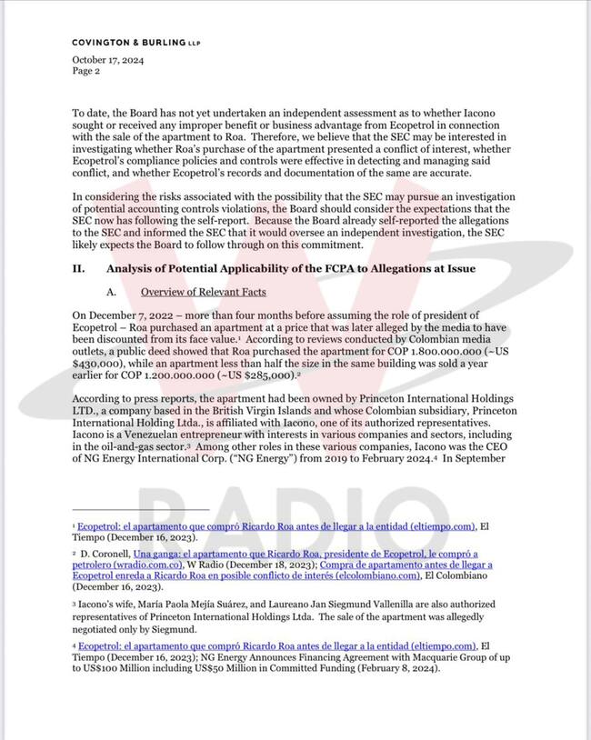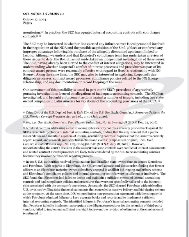 El memorando de Covington & Burling LLP concluye de la siguiente manera: “En resumen, es nuestra opinión que es poco probable que la SEC lleve a cabo una investigación formal de Ecopetrol por posibles violaciones de las disposiciones contra el soborno de la FCPA. Sin embargo, basándonos en las acciones pasadas de aplicación de la SEC, creemos que la SEC podría decidir investigar a Ecopetrol para determinar si violó las disposiciones contables de la FCPA debido a controles inadecuados o documentación falsa sobre conflictos de intereses y el proceso de adjudicación de contratos. Dado ese riesgo, la Junta debería cumplir con su compromiso con la SEC de llevar a cabo una investigación independiente sobre las acusaciones sobre la compra del apartamento de Roa y la relación comercial de Ecopetrol con Iacono y sus empresas”.