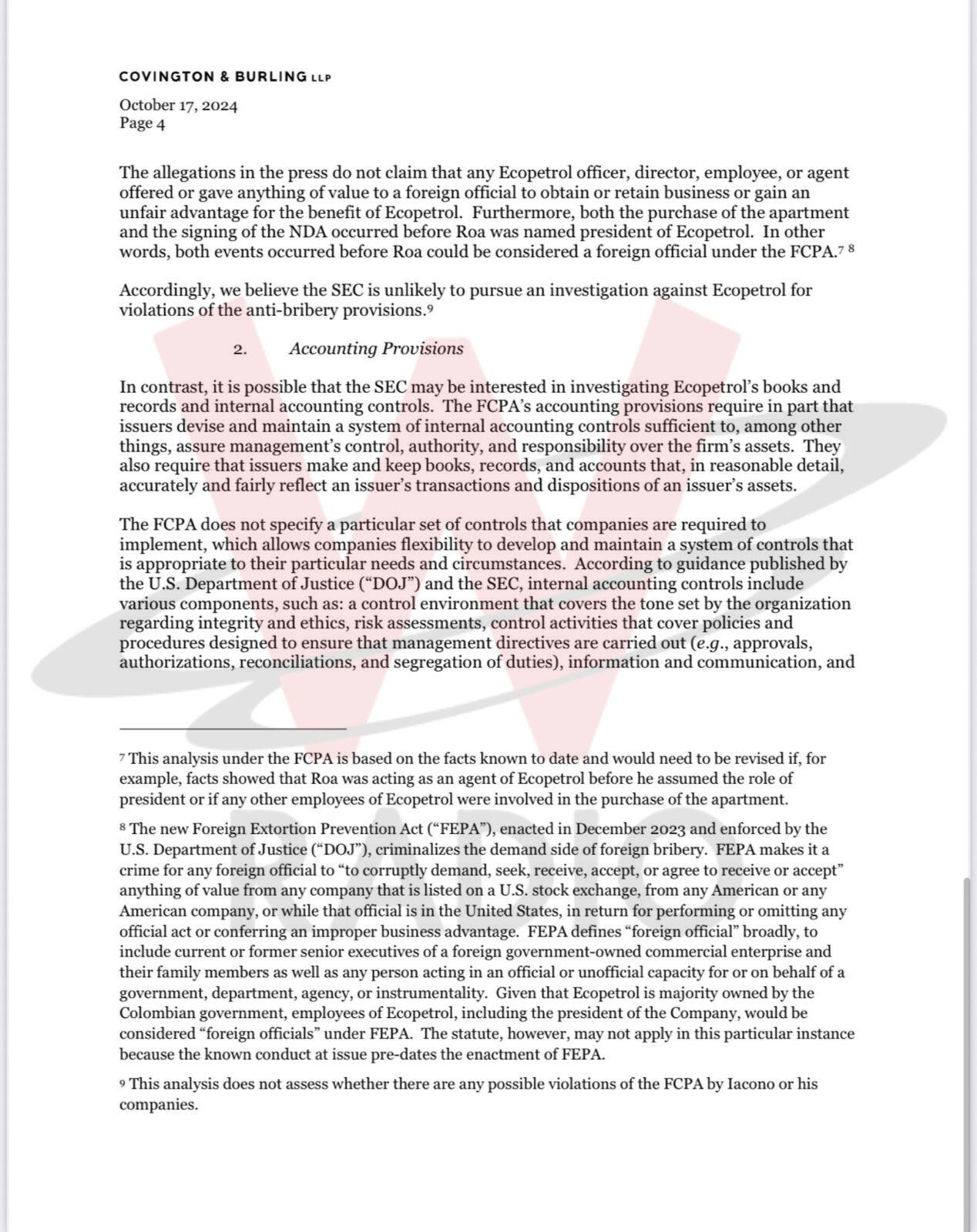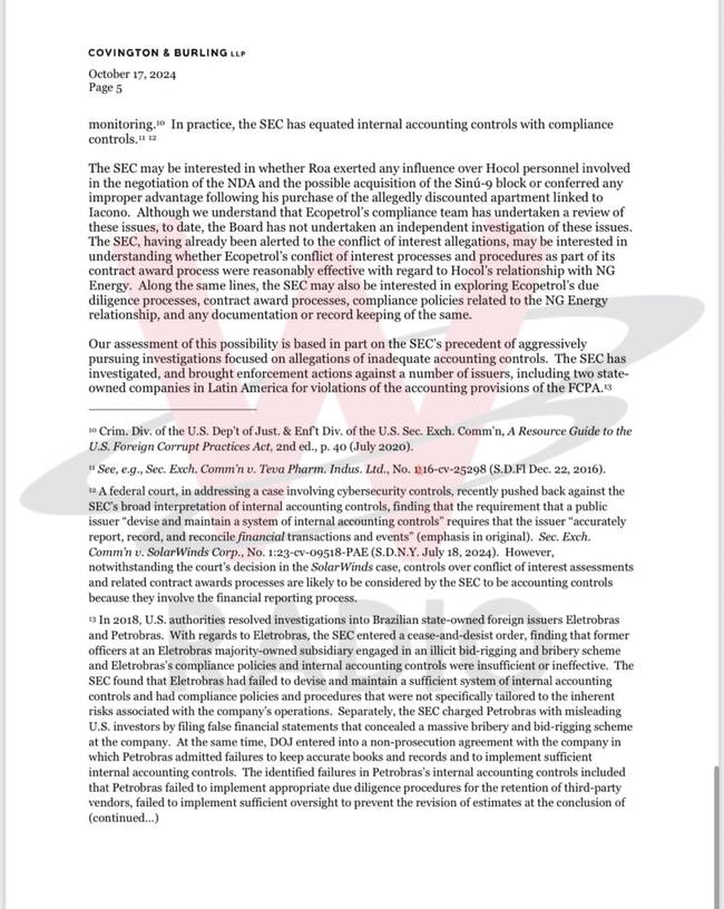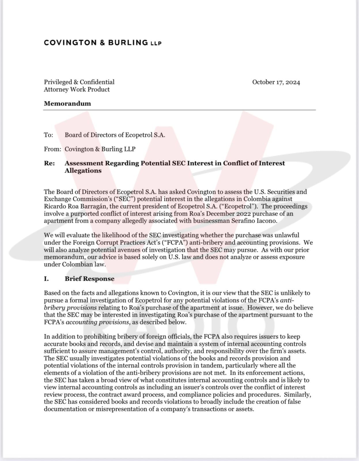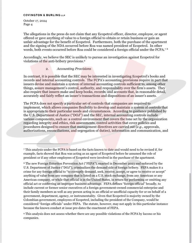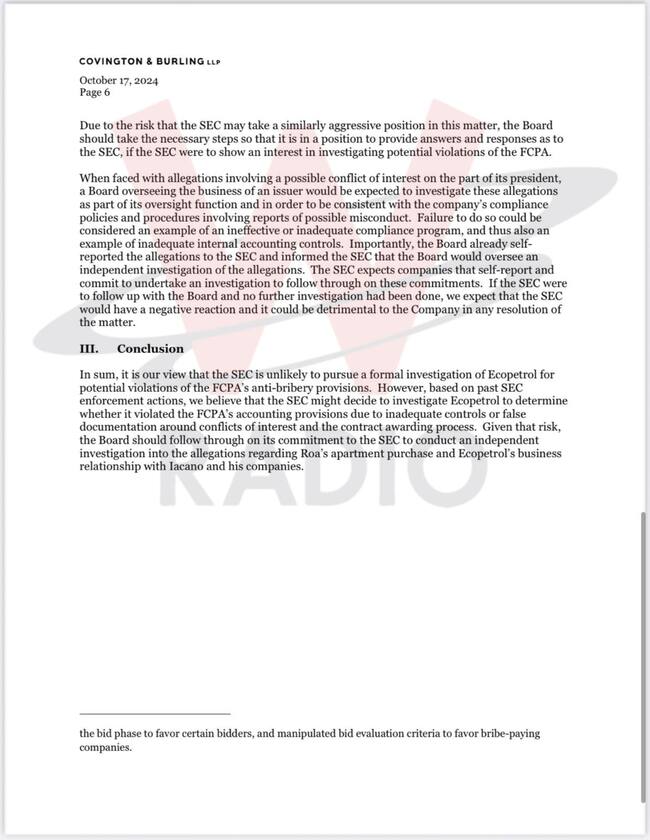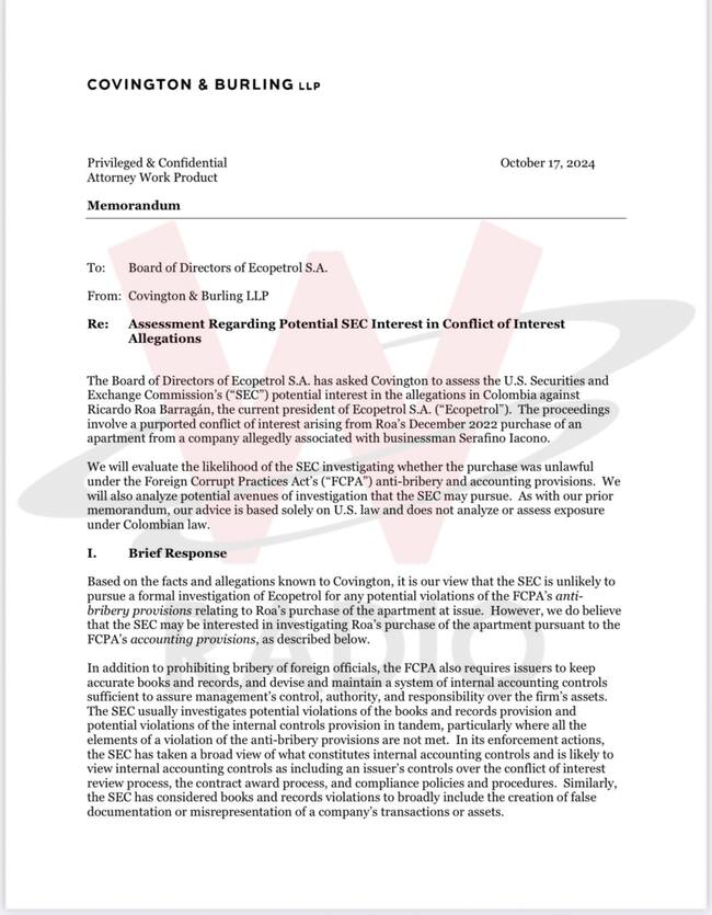 El memorando de Covington & Burling LLP concluye de la siguiente manera: “En resumen, es nuestra opinión que es poco probable que la SEC lleve a cabo una investigación formal de Ecopetrol por posibles violaciones de las disposiciones contra el soborno de la FCPA. Sin embargo, basándonos en las acciones pasadas de aplicación de la SEC, creemos que la SEC podría decidir investigar a Ecopetrol para determinar si violó las disposiciones contables de la FCPA debido a controles inadecuados o documentación falsa sobre conflictos de intereses y el proceso de adjudicación de contratos. Dado ese riesgo, la Junta debería cumplir con su compromiso con la SEC de llevar a cabo una investigación independiente sobre las acusaciones sobre la compra del apartamento de Roa y la relación comercial de Ecopetrol con Iacono y sus empresas”.