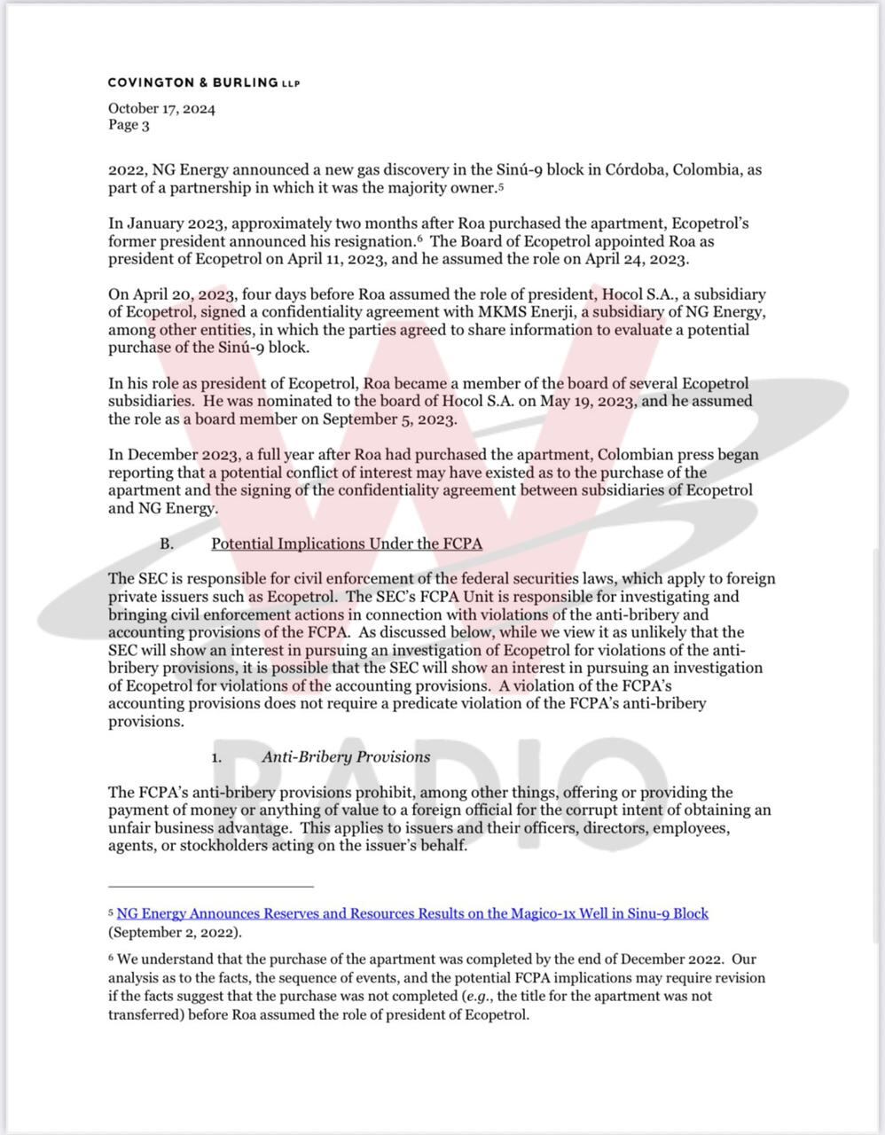 El documento escrito en inglés dice que si bien es poco posible que la SEC investigue directamente a Ecopetrol por esta transacción, lo que es muy probable es que quiera saber si el negocio de Roa se adelantó sin vulnerar medidas contables establecidos por la FCPA, la ley de prácticas corruptas en el extranjero.