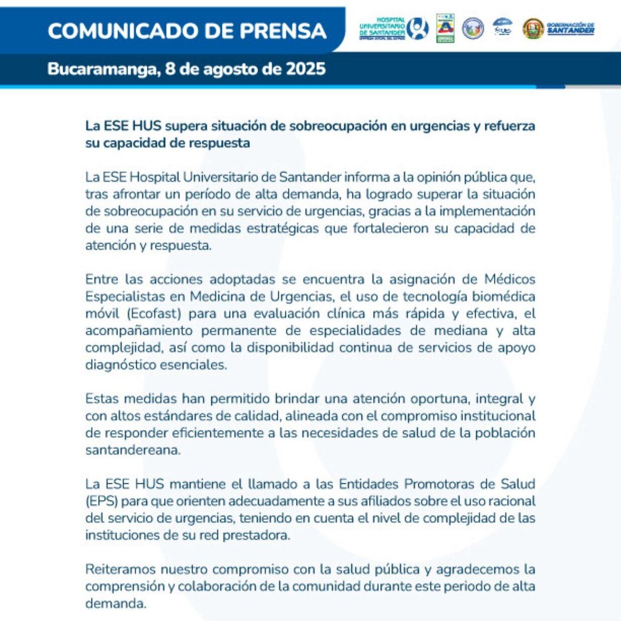 Este es el comunicado oficial emitido por el Hospital Universitario de Santander:
