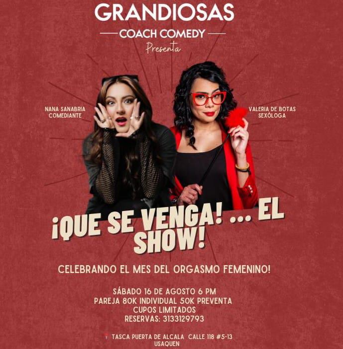 El 16 de agosto en la Tasca Puerta de Alcalá GranDiosas Coach Comedy llega con un especial sin censura, “Que se venga… El show”. Una noche de comedia, educación sexual y energía femenina. Este formato de tertulia con propósito, creado por la comediante y periodista Nana Sanabria, combina humor, reflexiones y conversación sin tapujos para mujeres que quieren reírse, aprender y reconectar con su poder personal. En esta edición, la invitada será la sexóloga y escritora Valeria DeBotas, experta en sexualidad femenina, autoestima con dosis de empoderamiento.