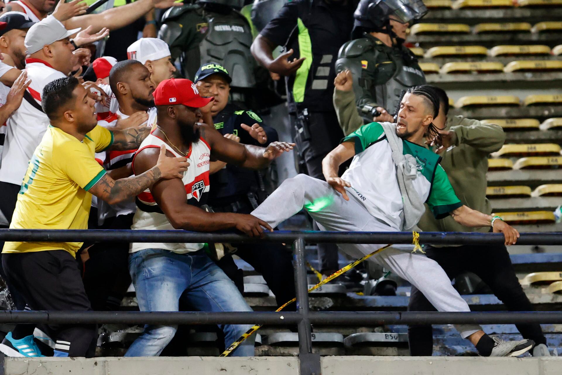 AME9697. MEDELLÍN (COLOMBIA), 12/08/2025.- Un hincha (i) de Sao Paulo se enfrenta a los de Nacional este martes, luego del partido de los octavos de final de la Copa Libertadores entre Atlético Nacional y Sao Paulo en el estadio Atanasio Girardot en Medellín (Colombia). EFE/Mauricio Dueñas Castañeda / MAURICIO DUEÑAS CASTAÑEDA