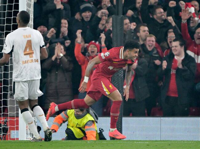 Luis Díaz celebra uno de sus goles con Liverpool, marcado al Bayer Leverkusen y al fondo Jonathan Tah / Getty Images / picture alliance