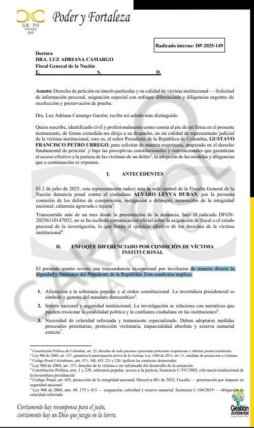 El abogado del presidente Gustavo Petro, radicó un derecho de petición ante la fiscal general, Luz Adriana Camargo, solicitando medidas urgentes y celeridad en la investigación penal contra el excanciller Álvaro Leyva por presunta conspiración, instigación a delinquir, menoscabo de la integridad nacional, calumnia agravada e injuria.