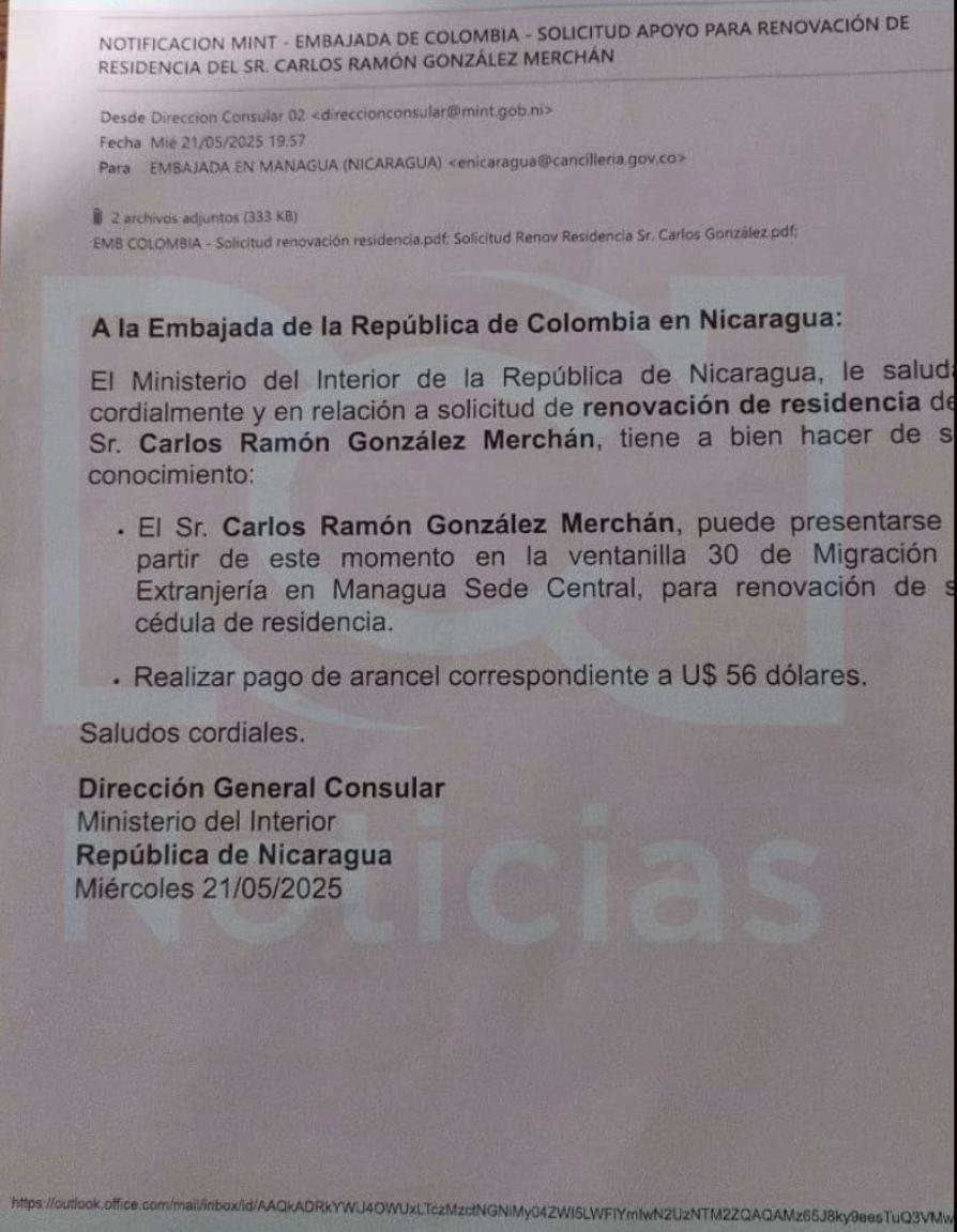 “El Sr Carlos Ramón González Merchán puede presentarse a partir de este momento en la ventanilla 30 de Migración Extranjería en Managua Sede Central, para renovación de su cédula de residencia. - Realizar el pago de arancel correspondiente a U$ 56 dólares”, fue la respuesta de la Dirección General Consular del Ministerio del Interior de ese país, el mismo 21 de mayo.