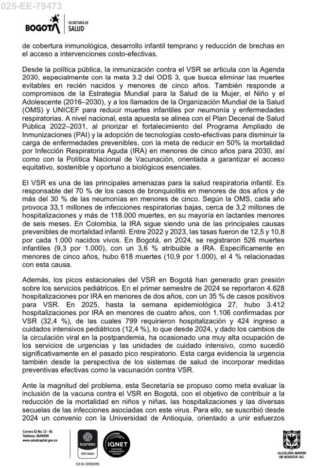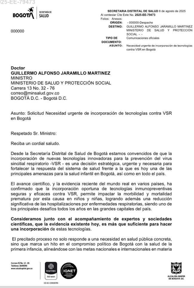“Desde la Secretaría Distrital de Salud de Bogotá estamos convencidos de que la incorporación de nuevas tecnologías innovadoras para la prevención del virus Sincital respiratorio – VSR- es una decisión estratégica, urgente y necesaria para fortalecer la respuesta del sistema de salud frente a la que es hoy una de las principales amenazas para la salud infantil en Bogotá, así como en todo el país”. Escribió el secretario en la comunicación.