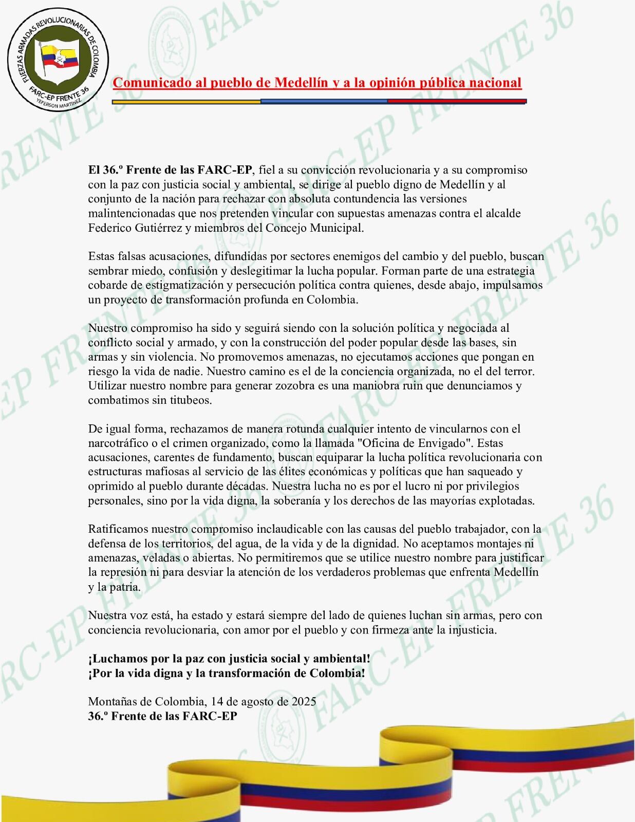 No aceptamos montajes ni amenazas, veladas o abiertas. No permitiremos que se utilice nuestro nombre para justificar la represión ni para desviar la atención de los verdaderos problemas que enfrenta Medellín y la patria”, recalcó el grupo ilegal en el comunicado público.
